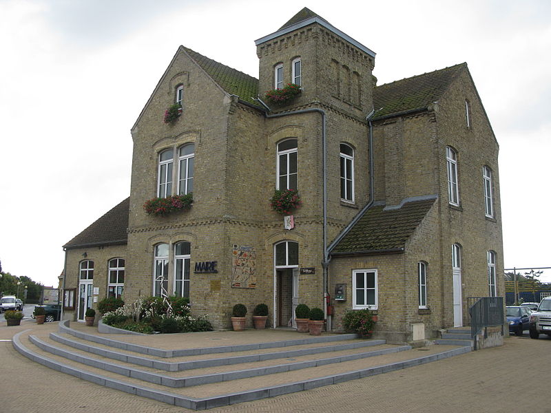 ![]() L'hôtel de ville de Brouckerque, autrefois appelé Wethuys (maison de la loi), construit en 1868 par François Napoléon Develle. En plus de la mairie, le bâtiment accueille l'école des garçons et une bibliothèque à l'étage. En 1942, les Allemands enlèvent la toiture de la tour de la mairie pour y installer une guérite d'observation entièrement vitrée munie de glaces coulissantes. Le toit sera reconstruit après la guerre, mais sans les flèches d'origines ornementées de bulbes. source photo : Jiel Beaumadier crédit photo : D.R. | |