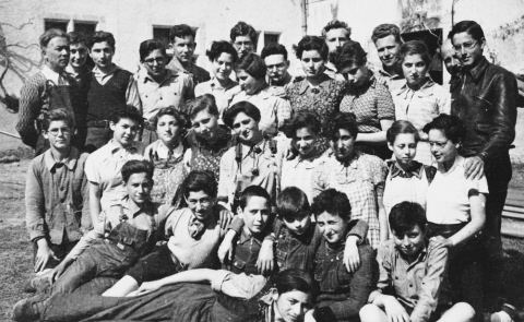 Dernier rang : Kurt Moser, Ernst Schlesinger, Irma Seelenfreund, Edgar Chaim, Helga Klein, Léo Lewin, Ruth Herz, Manfred Kemlet, Rosemarie Cosmann, Emil Dortort, Inge Schragenheim, Hans Garfunkel, Max Schaechtele, Bertrand Elkan, Addi Nussbaum (Adolf) et M. Palau